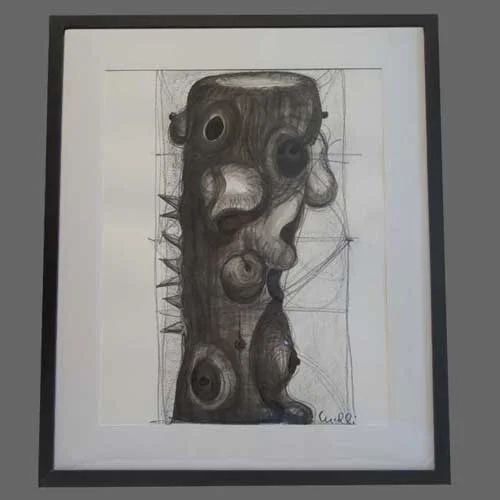 These seven paintings are studies for sculptured pieces, in particular, the seven deadly sins. They were used for proportioning the raw wood prior to executing cuts, subtractive carving and or added constructive pieces, and finished in concert with the sculptures. The paintings are 18β x 24β, acrylic and carbon pencil on 140lb French paper and museum framed on acid free backings.